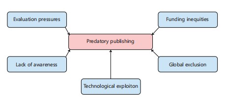 The rise of predatory publishing is closely tied to the growth of open-access models. While open access aims to democratize knowledge, the “author-pays” model has created fertile ground for exploitation. Predatory journals mimic legitimate outlets, charging fees without providing quality assurance5. Studies estimate that tens of thousands of predatory journals are currently in operation, publishing hundreds of thousands of articles annually6. In the Global North, researchers are increasingly aware of the risks and better equipped with institutional safeguards. Conversely, scholars in the Global South often lack training in identifying predatory outlets, face language barriers, and have fewer opportunities to publish in reputable journals7. This asymmetry illustrates a deeper structural imbalance in global scholarly communication, reinforcing what Santos8 terms “epistemic injustice.”The systemic drivers of predatory publishing are broadly categorized into six, including evaluation pressures, funding inequities, lack of awareness, global exclusion, and technological exploitation collectively create vulnerabilities that sustain exploitative publishing practices. The figure illustrates the systemic drivers of predatory publishing, showing that these factors collectively create vulnerabilities that sustain exploitative publishing practices (Fig. 1).