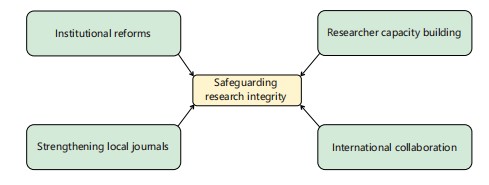 Pathways forward: The key pathways to safeguarding research integrity entail emphasizing the role of institutional reforms, researcher capacity building, upholding local journals, and fostering international collaboration as interconnected strategies to counter predatory publishing (Fig. 2).